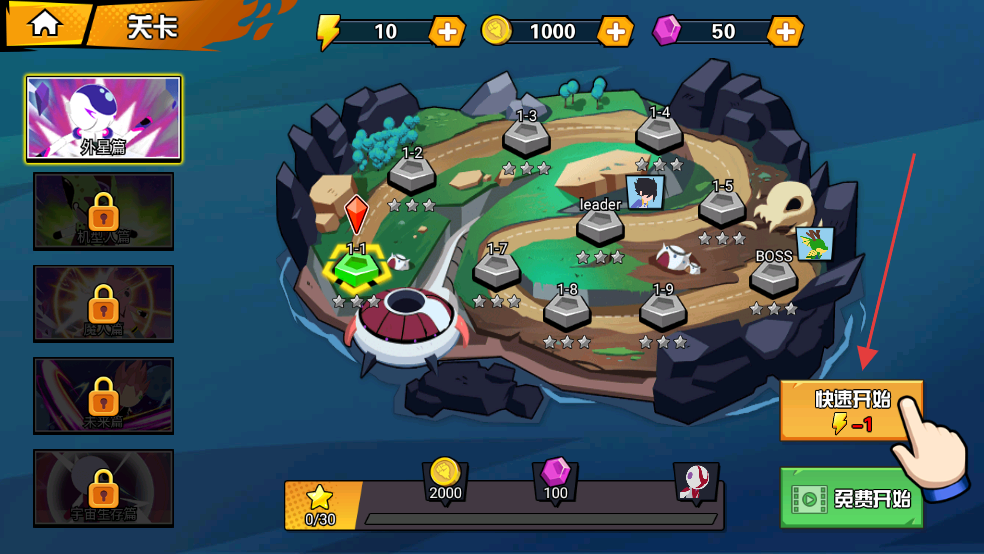 1、在關(guān)卡選擇界面,點(diǎn)擊【快速開始】可進(jìn)入戰(zhàn)斗,優(yōu)先挑戰(zhàn)解鎖的外星篇關(guān)卡。