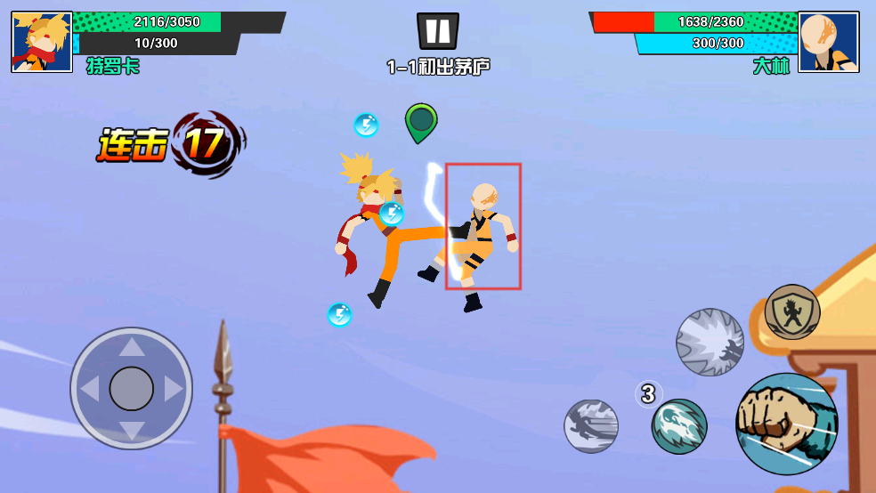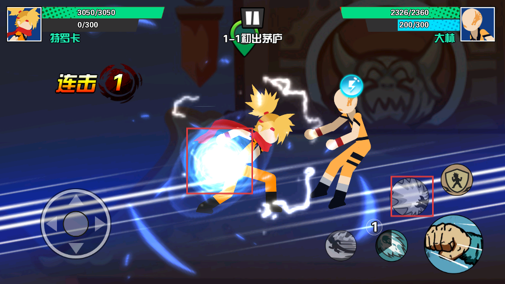 3、合理使用技能按鈕釋放強(qiáng)力招式,如帶有閃電特效的技能,可快速削減敵人血量。