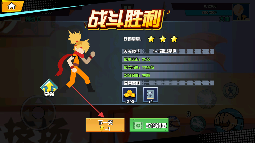 4、戰(zhàn)斗勝利后點(diǎn)擊【下一關(guān)】按鈕,進(jìn)入下一場戰(zhàn)斗,獲取金幣和道具獎(jiǎng)勵(lì)提升戰(zhàn)力。