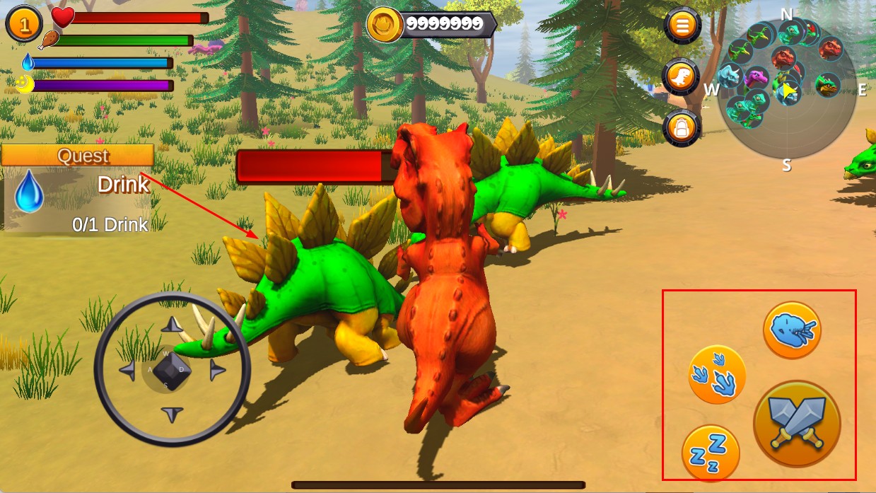 3、用虛擬搖桿操控霸王龍移動,優(yōu)先完成【0/1-Drink】任務(wù),或前往帶感嘆號的茅草屋接取新任務(wù)。