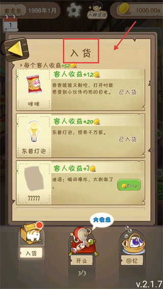 1、進入【入貨】界面,解鎖各類商品如咪咪、東普燈泡等,提升每個客人的收益,積累更多金幣。