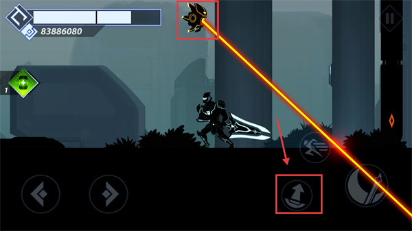 3、遇到激光敵人時,尋找時機點擊跳躍按鈕攻擊它,確保自身安全。
